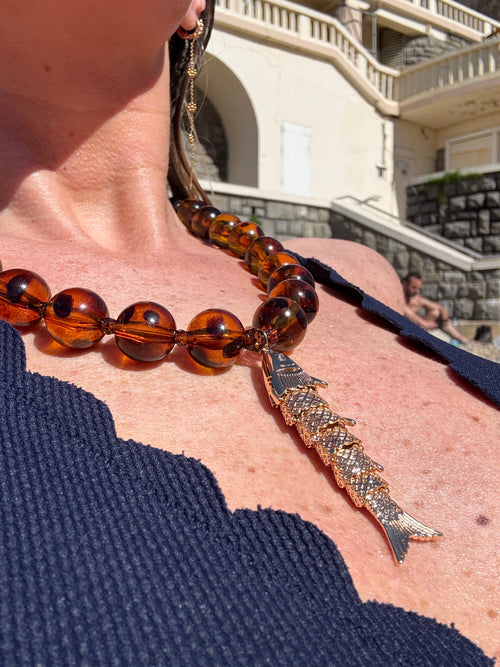 Élégant et singulier, le collier Adèle se distingue par ses perles ambrées aux reflets profonds, sublimées par un pendentif poisson qui apporte une signature délicate à la pièce.